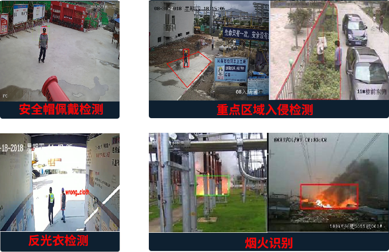 | 安全帽佩戴检测 重点区域入侵检测 反光衣检测 烟火识别 |