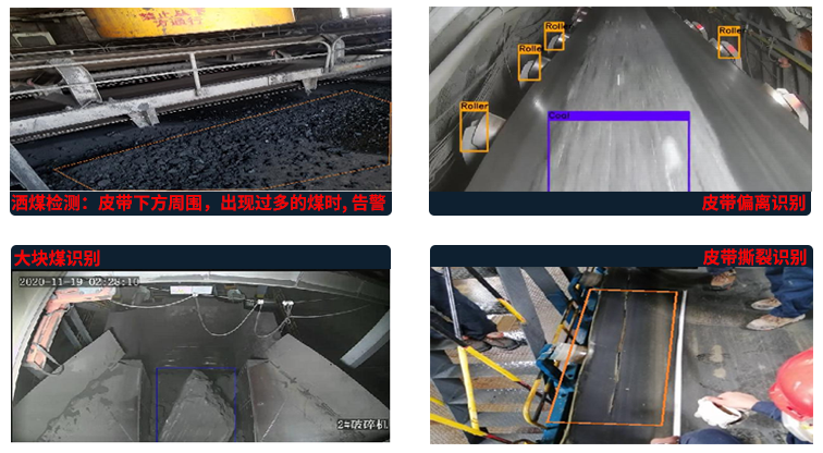 | 49 | 煤矿传输带检测 | 支持识别传送皮带有煤、无煤、多煤少煤状态、皮带偏移等 状态识别,识别皮带上的锚杆、矸石、木板、编织袋等异物 |