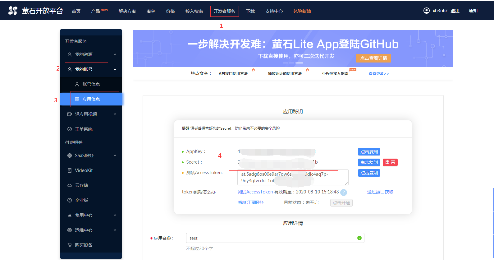 步骤二:登陆进去后,开发者服务--->我的账号--->应用信息,在右边会有AppKey跟Secret,分别复制出来;