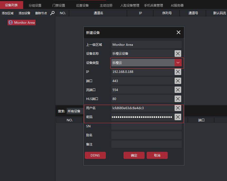 设备类型选乐橙云;用户名填写上面网页中的App Key;密码填写上面网页中的 App Secret;点确定,设备添加完成,读到设备树。