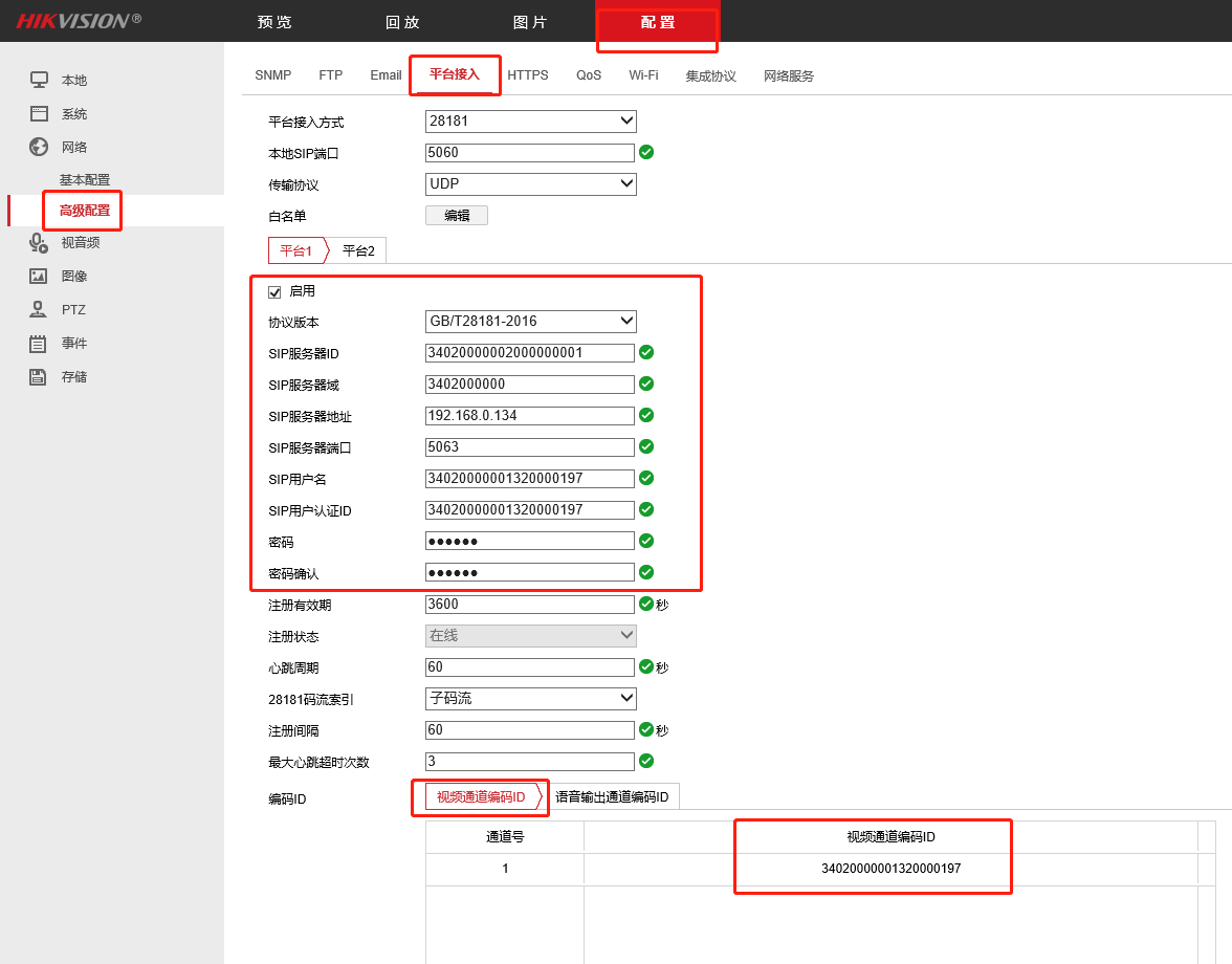 步骤一:在前端设备的GB/T 28181 内启用国标接入,并填写相应信息;