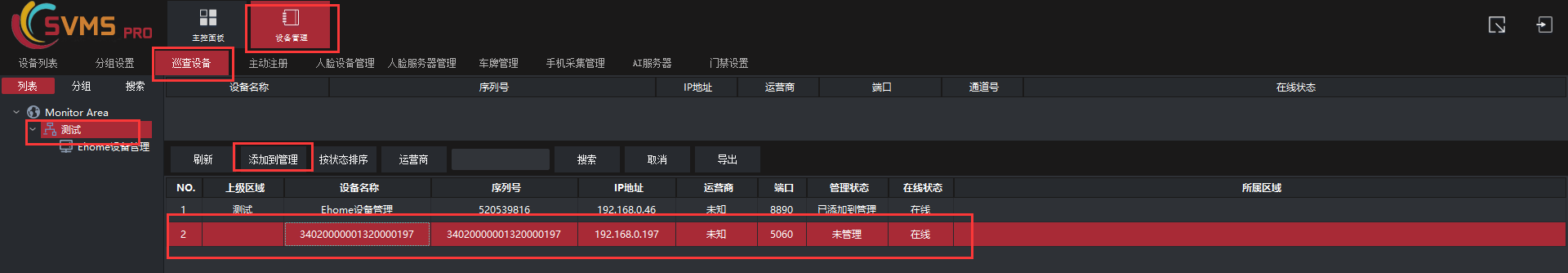 在SVMS Pro客户端内点击设备管理,再点击NAT设备; 选择注册上来的设备,左侧选择区域,点击添加到管理按钮,输入设备名称,点击确定,即可添加成功。